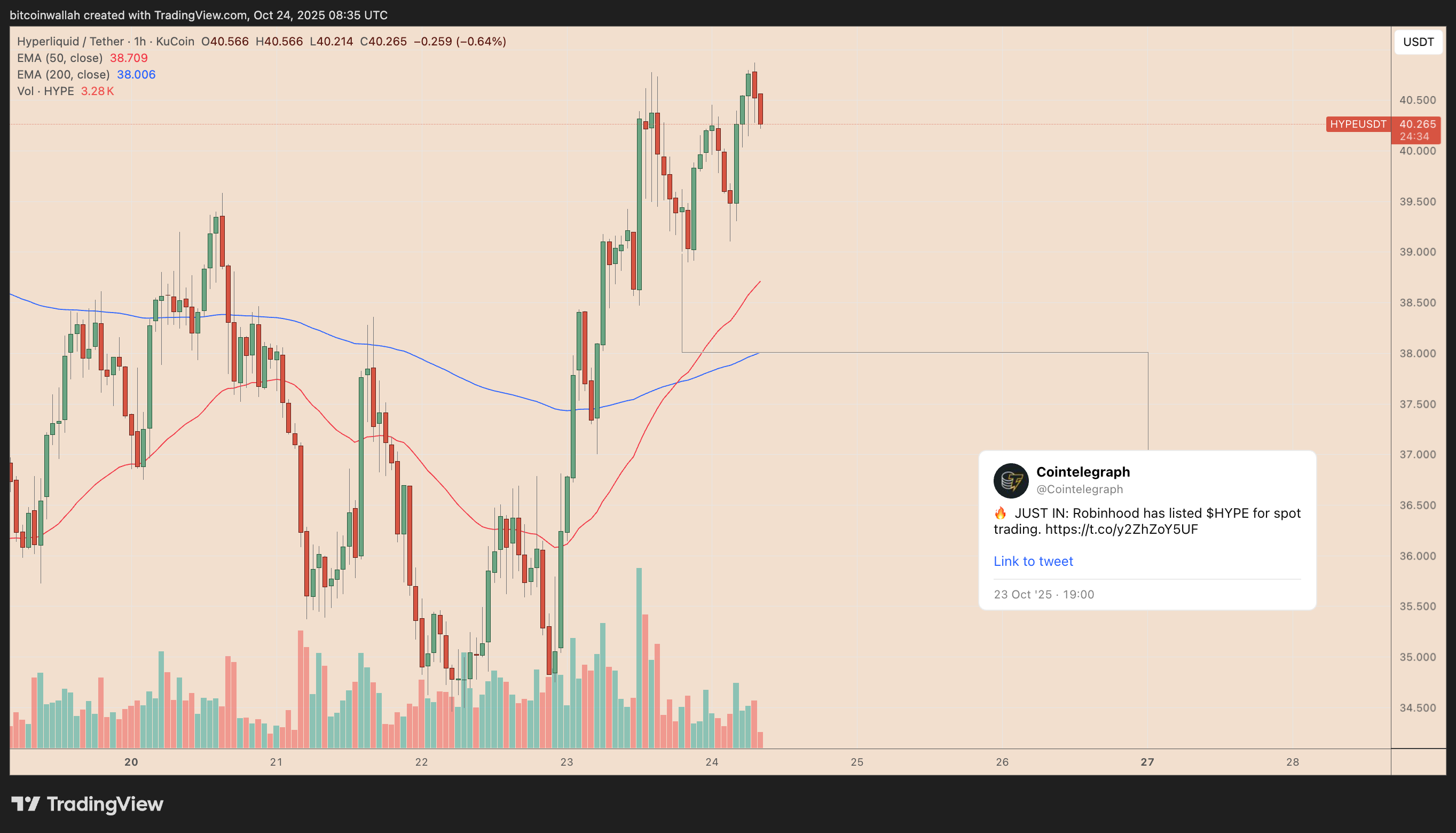 HYPE is poised for a significant price increase of 40% after its recent listing on Robinhood, according to market trends.