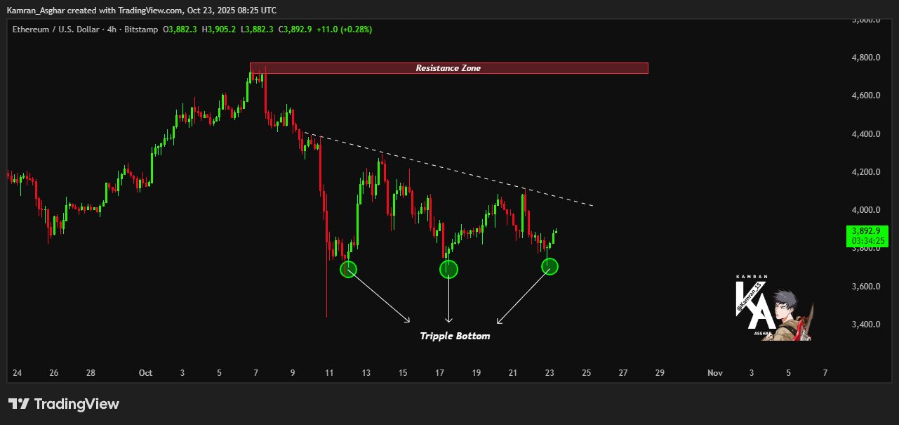 Currently, Ether faces a significant resistance zone near $3,950–$4,000, coinciding with the 50-period exponential moving average (50-period EMA). A decisive break above this neckline would confirm the triple bottom pattern, potentially leading Ether toward a price target of approximately $4,280—a 10% rise from current levels—by late October or early November.