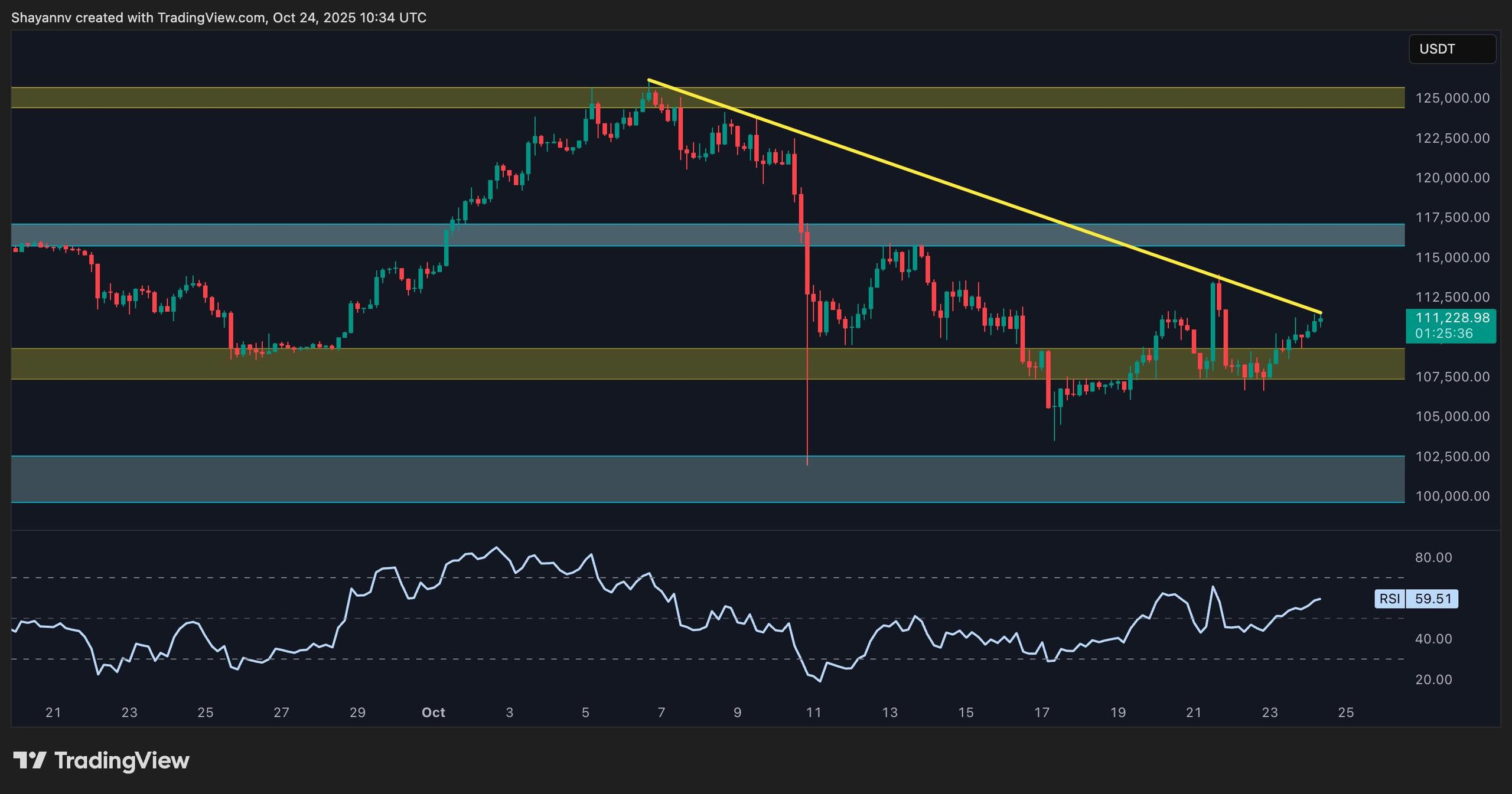 On the daily chart, BTC rebounded after finding support at the 200-day moving average around $108K, a level that has demonstrated strong demand in past corrections. This was also a foundational area for the bullish movements seen in September and early October.