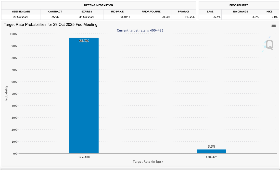 The CME Group’s FedWatch Tool, which forecasts market expectations on interest rate adjustments by the Federal Reserve, largely indicated a favored 0.25% cut scheduled for October 29.