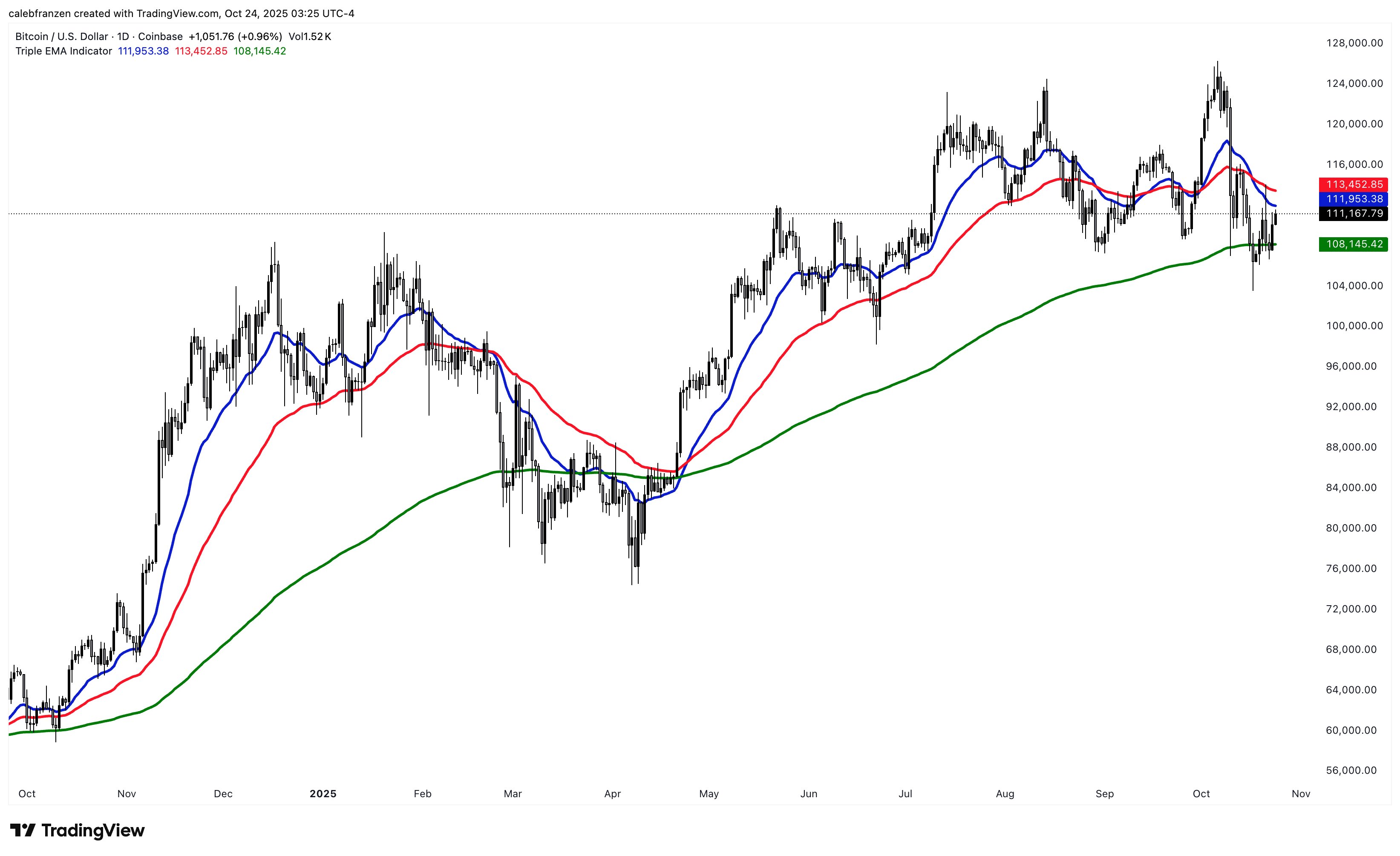 BTC/USD one-day chart with 21, 55, 200 EMAs. Source: Caleb Franzen/X
