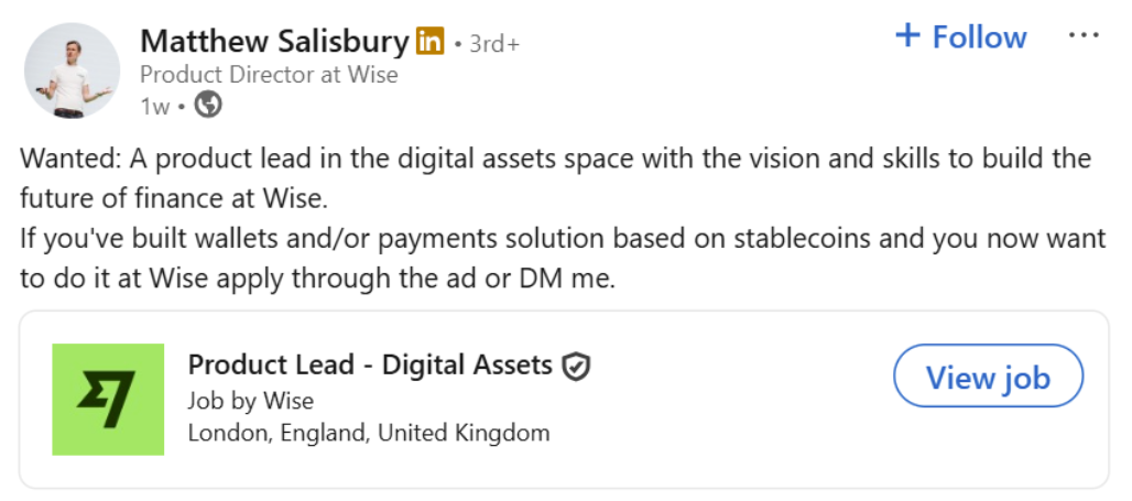 Matthew Salisbury, Wise’s product director, shared this opportunity via LinkedIn, emphasizing the preference for candidates with backgrounds in consumer-focused digital asset products. “If you’ve built wallets and/or payments solution based on stablecoins and now wish to continue this journey at Wise, please check the ad or DM me,” he wrote.