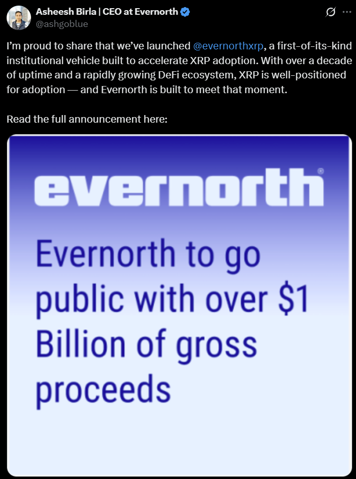 Evernorth Holdings, a digital asset entity supported by Ripple Labs, is set to become public through a merger with Armada Acquisition Corp. II, facilitating the establishment of a new company focused on XRP treasury management. This merger could yield over $1 billion, with $200 million secured from Japan’s SBI Holdings. Additional funding is expected from Ripple, Kraken, Pantera Capital, and GSR. Once finalized, the new firm will be listed on Nasdaq under the symbol XRPN.