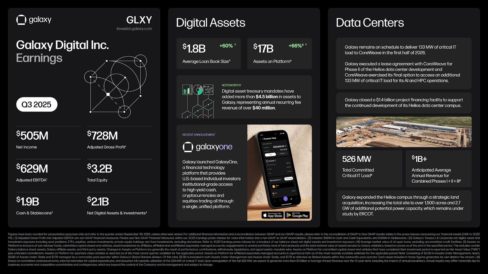 The report showed net earnings of $505 million, with adjusted totals reaching $629 million, attributed to successful digital asset operations and investments. Galaxy now oversees $3.2 billion in equities, including $1.9 billion in cash and stablecoins, with trading activity increasing by 140% compared to the prior quarter.