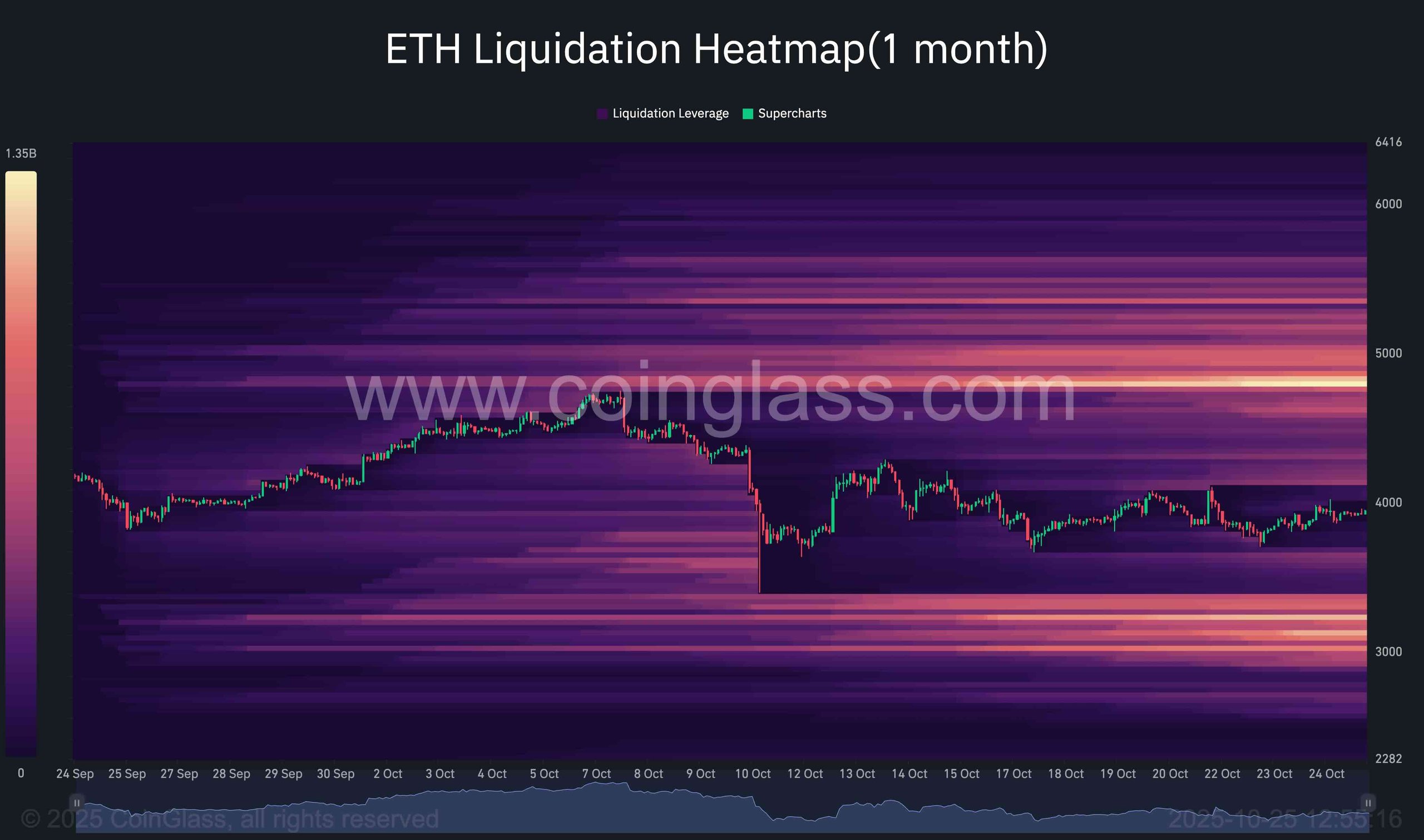 Overall, the heatmap suggests short-term volatility will remain concentrated within the $3,400–$4,800 corridor, with a slightly higher likelihood of reaching the upper range first due to the greater liquidity concentration above present levels.