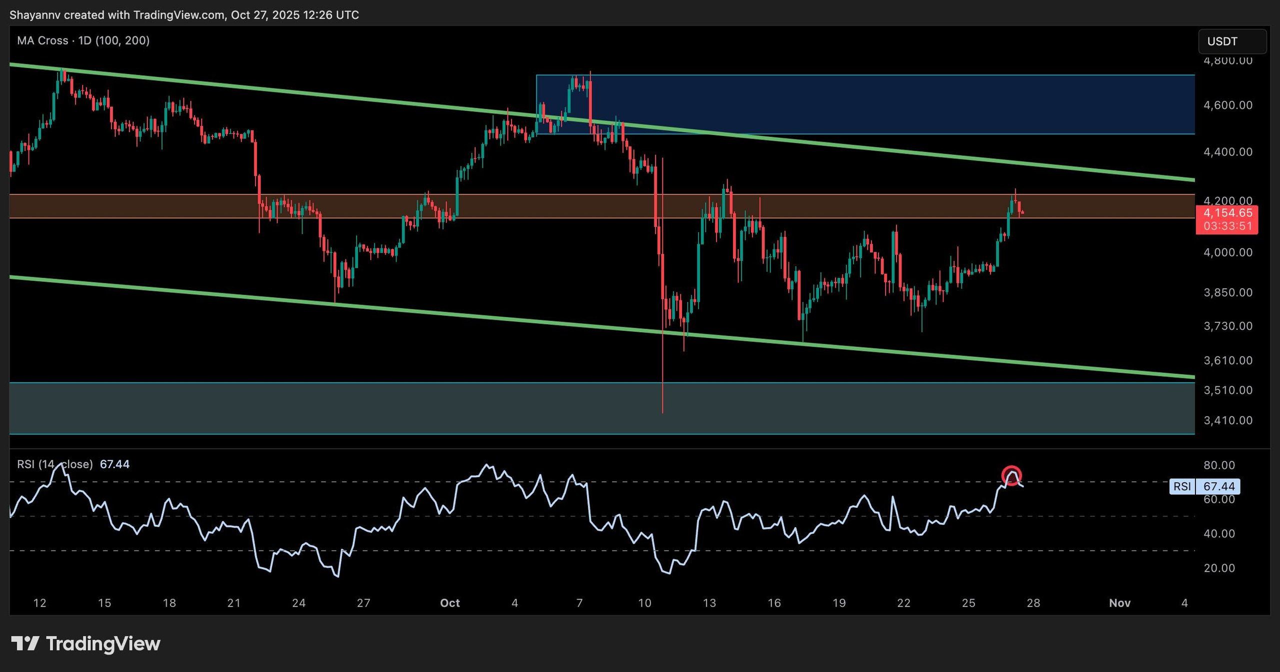 Ethereum is displaying renewed strength, attempting to breach crucial resistance levels following a noticeable drop in early October. The bounce from the lower barrier of the descending channel has propelled it toward $4,150. Although momentum is increasing, market caution persists as it approaches significant resistance.