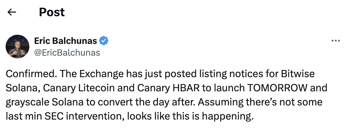 Bloomberg’s analyst Eric Balchunas noted that listing notifications have been recorded for Bitwise’s Solana ETF and Canary’s Litecoin and Hedera ETFs, all expected to become active on Tuesday.