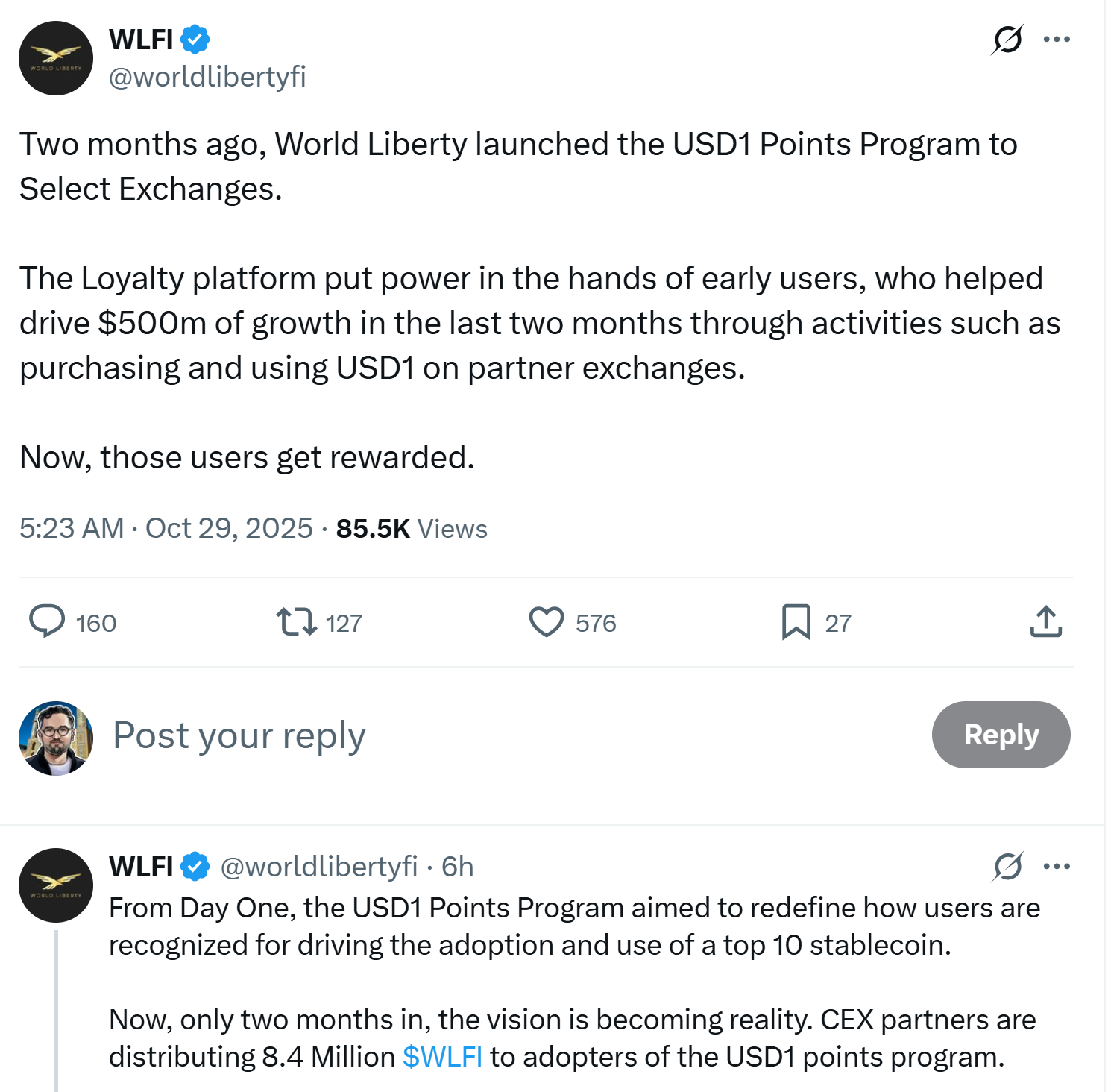 The airdrop will benefit users who signed up for the USD1 Points Program, which commenced two months ago to facilitate the use of World Liberty’s US dollar-backed stablecoin. Participants accrued points through trading USD1 pairs on allied exchanges and maintaining balances.
