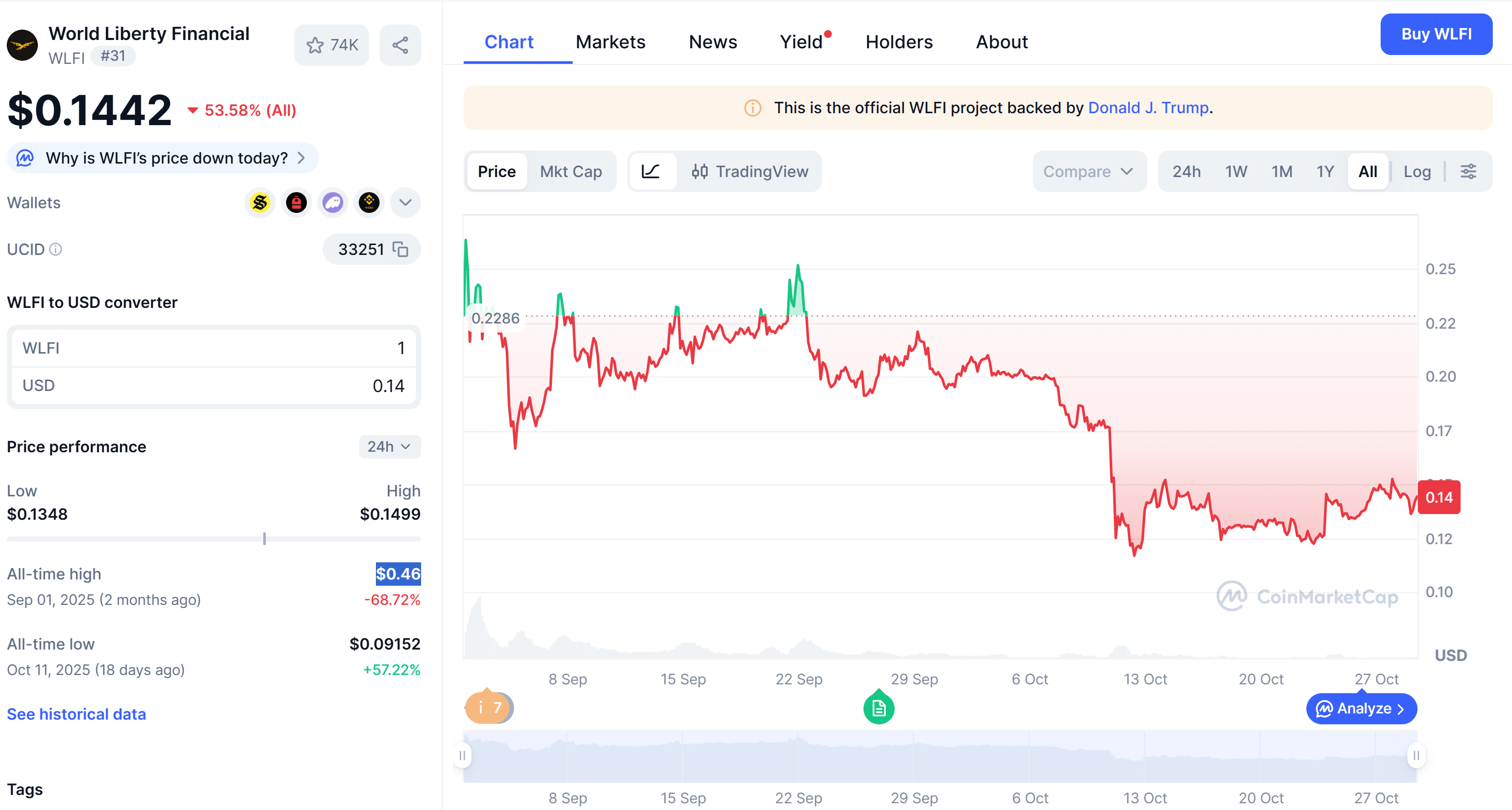 As per CoinMarketCap, WLFI is currently trading at $0.14, reflecting a 0.5% decline over the past 24 hours, and down nearly 70% from its all-time high of $0.46 stated in September.