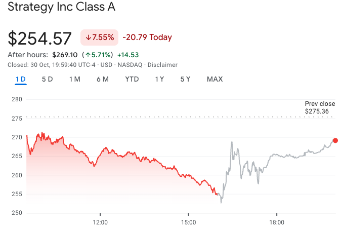 MicroStrategy’s stocks saw a rebound of 5.7% after hours, reaching over $269, despite finishing Thursday’s regular trading session down over 7.5% at $254.57, their lowest point in six months.