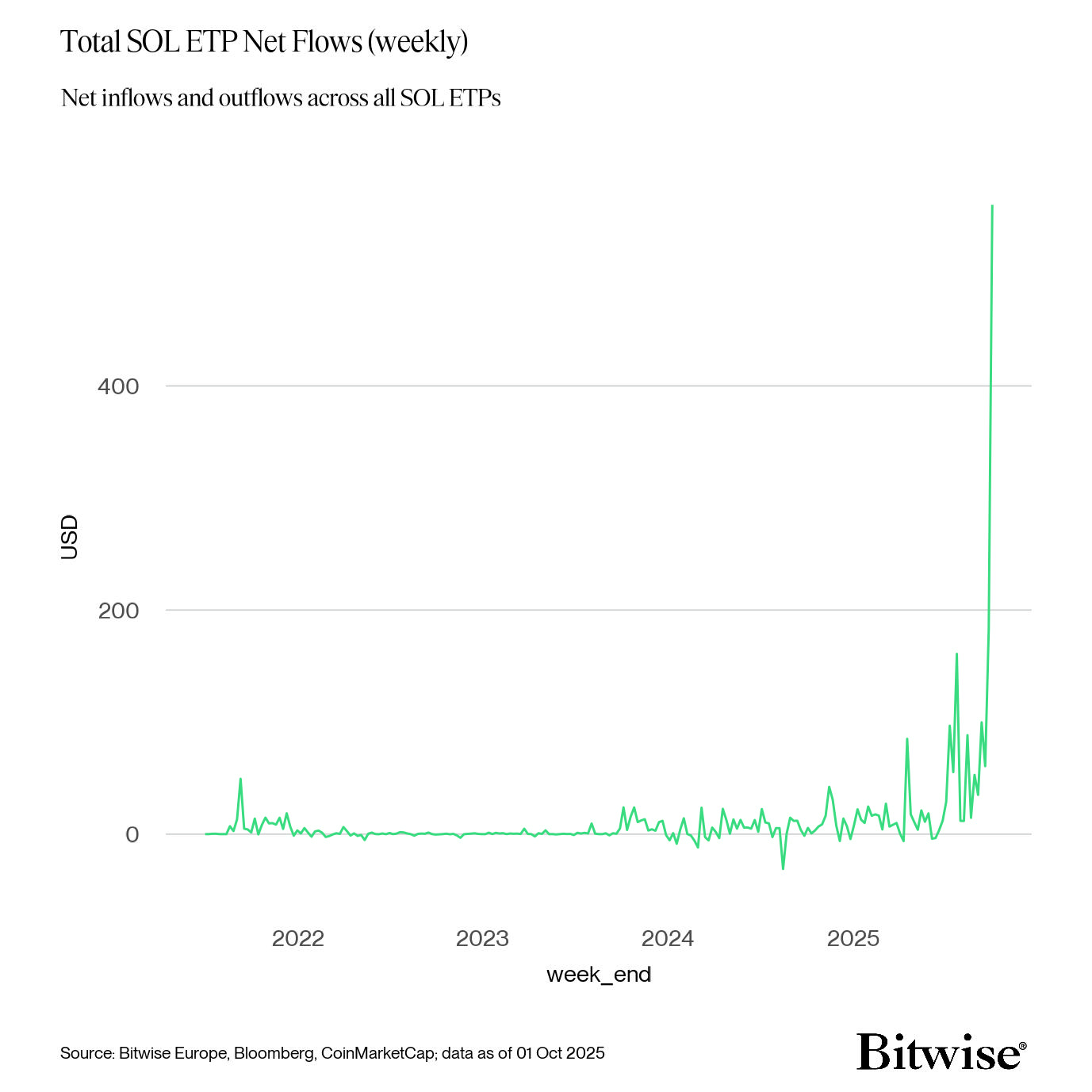 According to Bitwise, two of the Solana ETFs have attracted a combined inflow of $199.2 million in their first week alone, effectively showcasing investor confidence within this sector. Notably, Bitwise’s BSOL ETF was the leader, accumulating $401 million in assets under management (AUM) by October 31, representing over 9% of the global total for Solana ETPs.