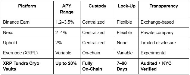 The introduction of Cryo Vaults is a significant breakthrough for the XRP ecosystem. Historically, options for earning yields on XRP were limited to centralized exchanges or interest-bearing accounts that required users to hand over their assets. In contrast, XRP Tundra’s solution is based on cryptographic proof, ensuring each staking transaction and reward distribution is directly managed on the blockchain, utilizing audited smart contracts.