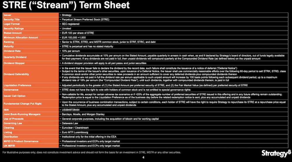 The newly issued STRE shares have priority over Strategy’s Perpetual Strike (STRK), Perpetual Stride (STRD), and common stock but are subordinate to its Perpetual Strife (STRF), Variable Rate Perpetual Stretch (STRC) shares and outstanding debts.